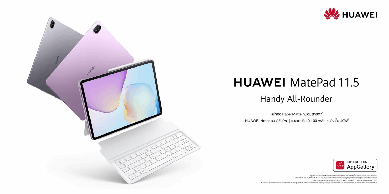 เตรียมพบกับราคาจำหน่ายอย่างเป็นทางการและสัมผัสกับประสิทธิภาพที่เหนือกว่าของ HUAWEI MatePad 11.5” 2025 ได้ในวันที่ 29 สิงหาคม 2568 นี้ ที่ HUAWEI Experience Store และร้านค้าที่ร่วมรายการทั้งแบบออฟไลน์และออนไลน์ รวมถึง HUAWEI Store และร้านค้าอย่างเป็นทางการของหัวเว่ยบนแพลตฟอร์ม Lazada, Shopee และ TikTok Shop สำหรับข้อมูลเพิ่มเติม สามารถติดตามได้ที่ Facebook Huawei Mobile TH