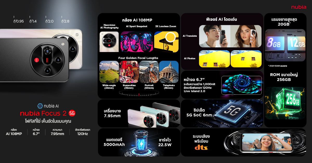 วงการสมาร์ทโฟนในประเทศไทยกลับมาคึกคักอีกครั้ง เมื่อ nubia (นูเบีย) ได้ประกาศเปิดตัวสมาร์ทโฟนรุ่นใหม่ล่าสุด nubia Focus2 5G อย่างเป็นทางการ ชูสโลแกน “Focus on your Vision โฟกัสที่ใช่ เห็นชัดในแบบคุณ” เจาะตลาดกลุ่มคนรุ่นใหม่ โดยเฉพาะคอนเทนต์ครีเอเตอร์และผู้ที่หลงใหลในการถ่ายภาพและวิดีโอ ที่ต้องการเครื่องมือสร้างสรรค์ผลงานคุณภาพสูงในราคาที่จับต้องได้ง่าย ด้วย ราคาเปิดตัวสุดเร้าใจเพียง 5,499 บาท