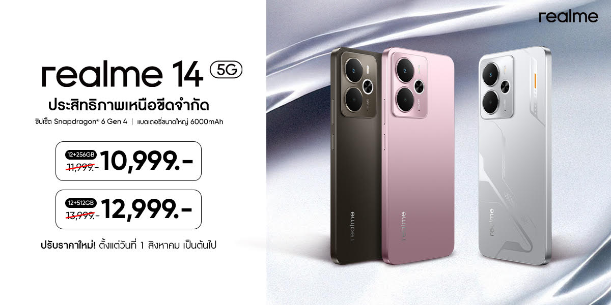 - realme 14 5G (รุ่น 12/512GB) จากราคาเดิม 13,999 บาท เหลือเพียง 12,999 บาท https://s.shopee.co.th/8UvDhsJDNK